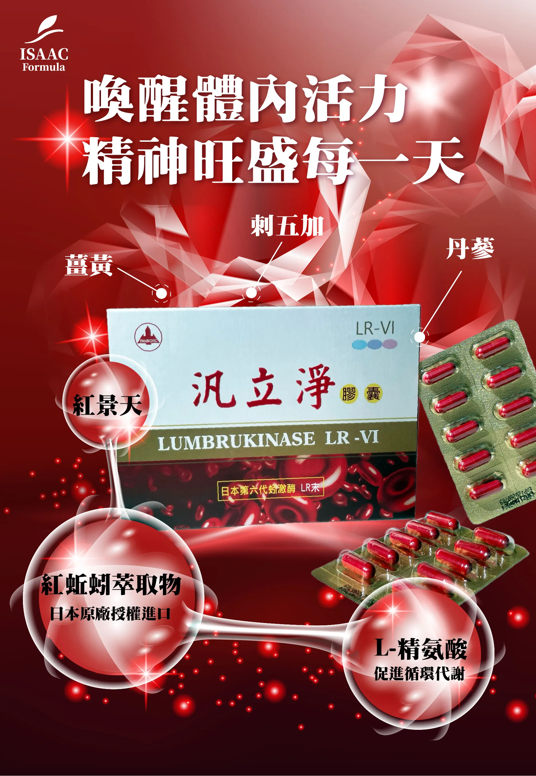 紅蚯蚓萃取物、紅景天根萃取物、丹蔘萃取物、薑黃萃取物、刺五加萃取物、L-精氨酸、玉米澱粉、甘露醇、微晶纖維素、硬脂酸鎂。